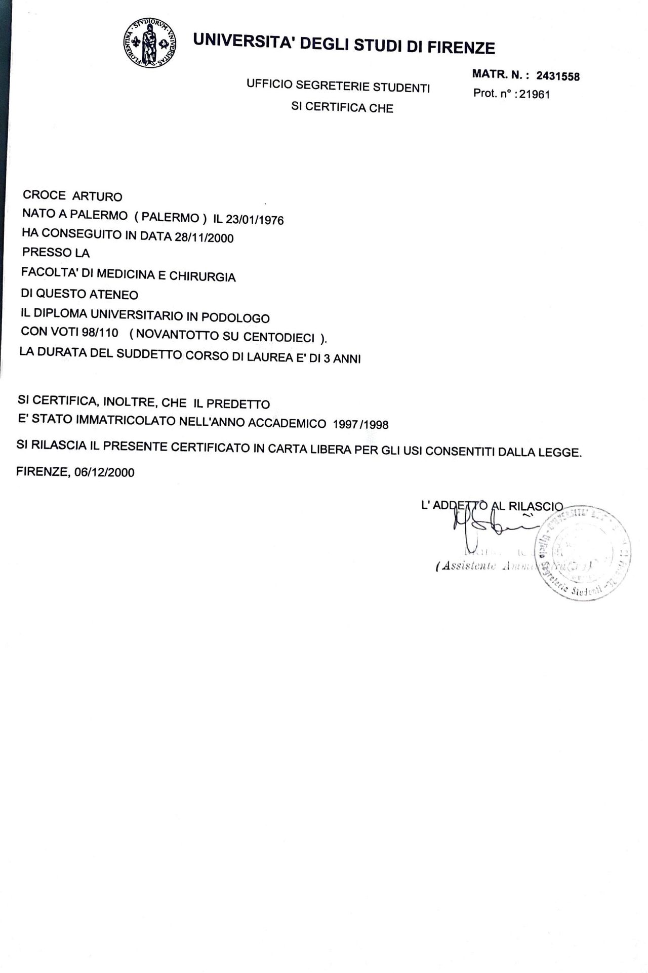 Podologo e posturologo iscritto all'albo di Palermo nr.02. Specializzato in tutte le affezioni ed algie del piede. Laureato in Podologia all'università degli studi di Firenze nel 2000.