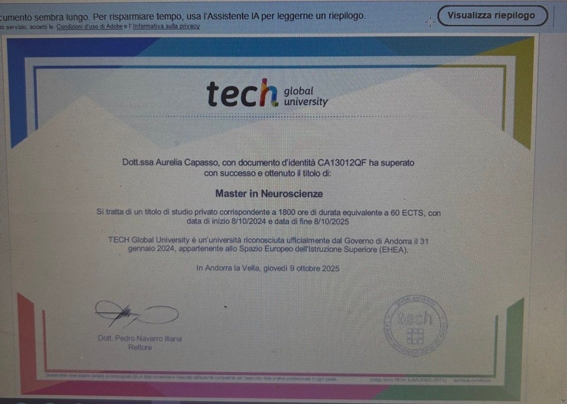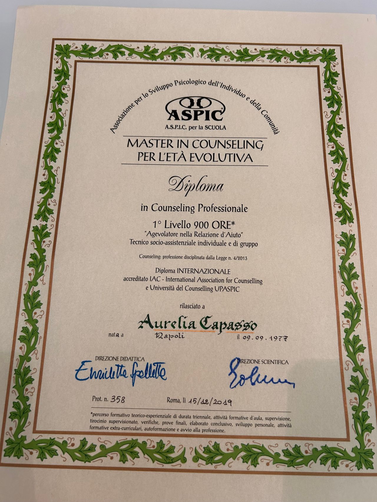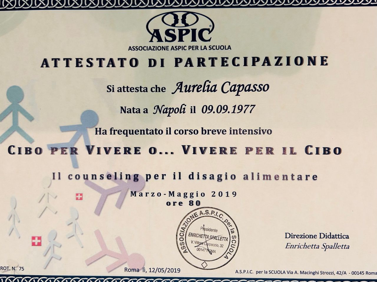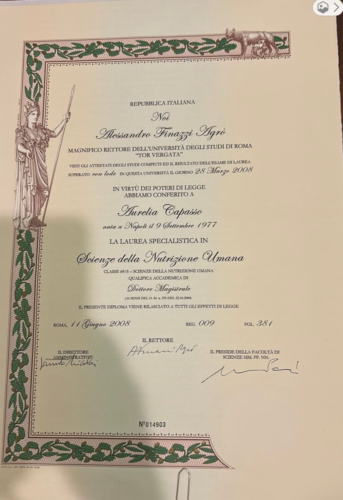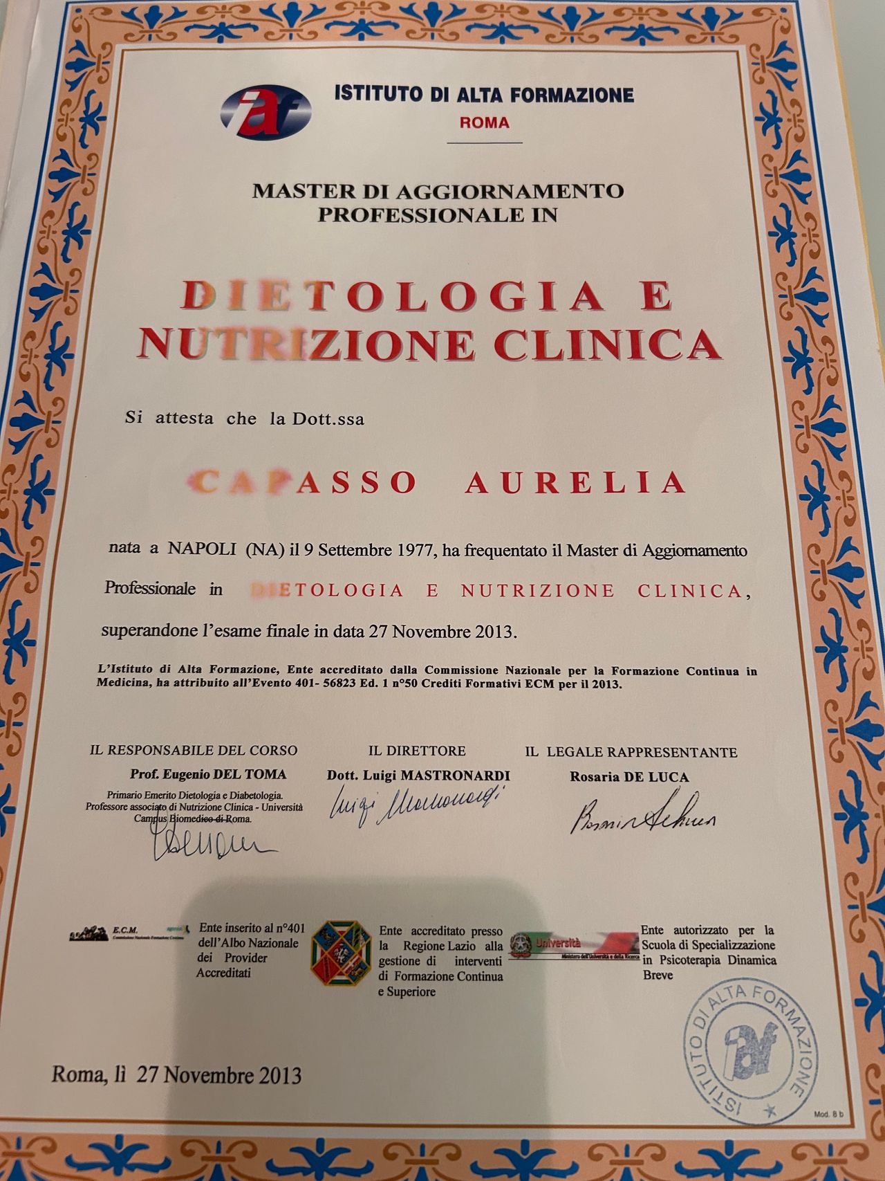 Sono la Dottoressa Aurelia Capasso, nutrizionista laureata in scienze della nutrizione umana. Ho effettuato diversi master di primo e secondo livello in nutrizione e cosmesi, in dietetica e nutrizione, scuola di alta formazione in dietologia e nutrizione clinica e conseguito la triennale in counseling per l'età evolutiva. Effettuo piani nutrizionali personalizzati di supporto per il dimagrimento, per le patologie del metabolismo e dell’intestino, programmi nutrizionali per gli sportivi e donne in gravidanza, faccio educazione alimentare ai bambini in età scolastica.