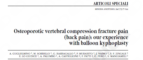 • 60 Cifoplastiche per cutanee: CONSISTE NELL’INTRODUZIONE ATTRAVERSO UNA SERIE DI CANNULE DI LAVORO,sotto guida fluoroscopica, DI DUE PALLONCINI DILATATORI CHE VENGONO GONFIATI ALL’INTERNO DEL CORPO VERTEBRALE CROLLATO, DETERMINANDO IN TAL MODO UN RIALZAMENTO DELLA VERTEBRA FRATTURATA. IN SEGUITO LA CAVITA’ FORMATA VIENE RESA STABILE MEDIANTE