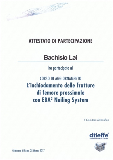 Tutti i servizi offerti sono accomunati da precisione, cura di ogni dettaglio, professionalità ed empatia: questi sono i valori che vengono perpetuati all'interno dello Studio, dove il Dottore è pronto ad assistere ogni paziente con il programma diagnostico e terapico ideale, seguendolo durante tutte le fasi dell'iter. Lo Studio del Dott. Bachisio Lai è attivo con servizi ambulatoriali per la diagnosi e la terapia ortopedica e traumatologica. Puoi rivolgerti all'esperto contando su approfondite competenze per la cura delle patologie muscolo-scheletriche con terapia infiltrativa, medica o riabilitativa.