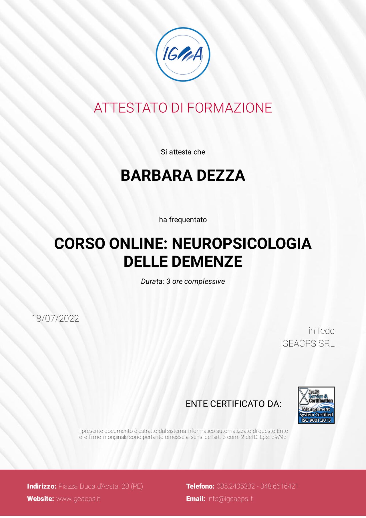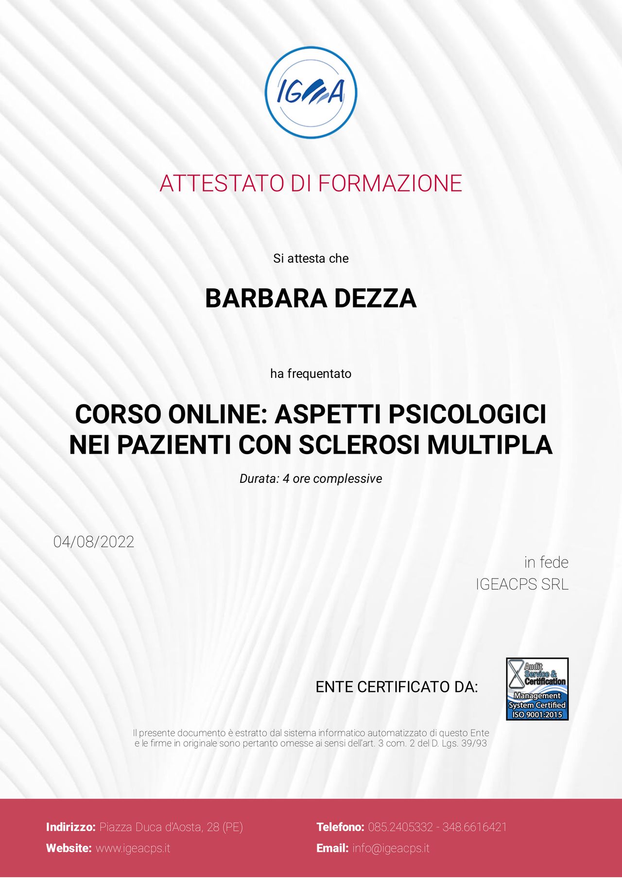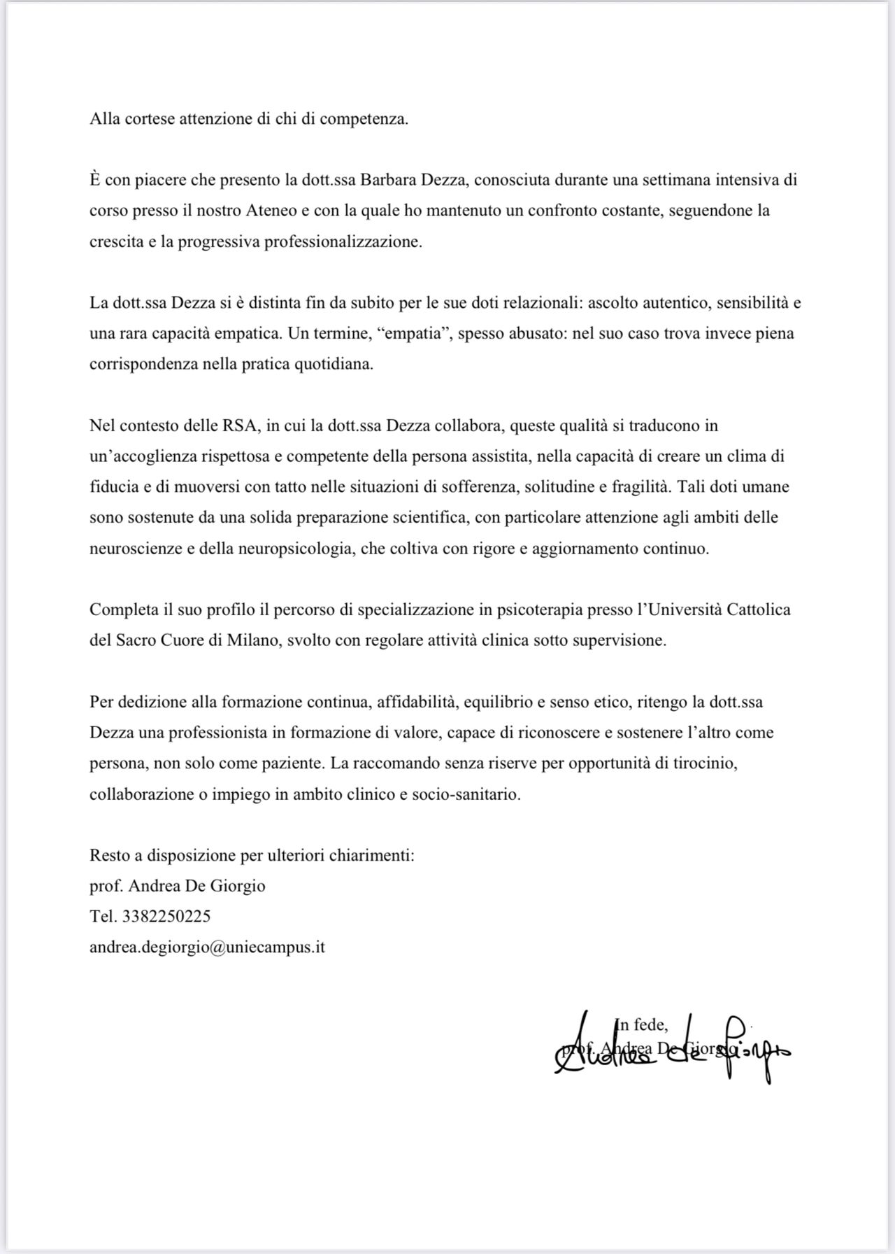 Mi sento di consigliare la dottoressa Dezza a qualsiasi tipologia di paziente, per qualsiasi esigenza di tipo psicologico: oltre ad essere molto competente in moltissimi ambiti è anche empatica, sa mettere a proprio agio e sa come aiutare le persone a ritrovare il proprio benessere.