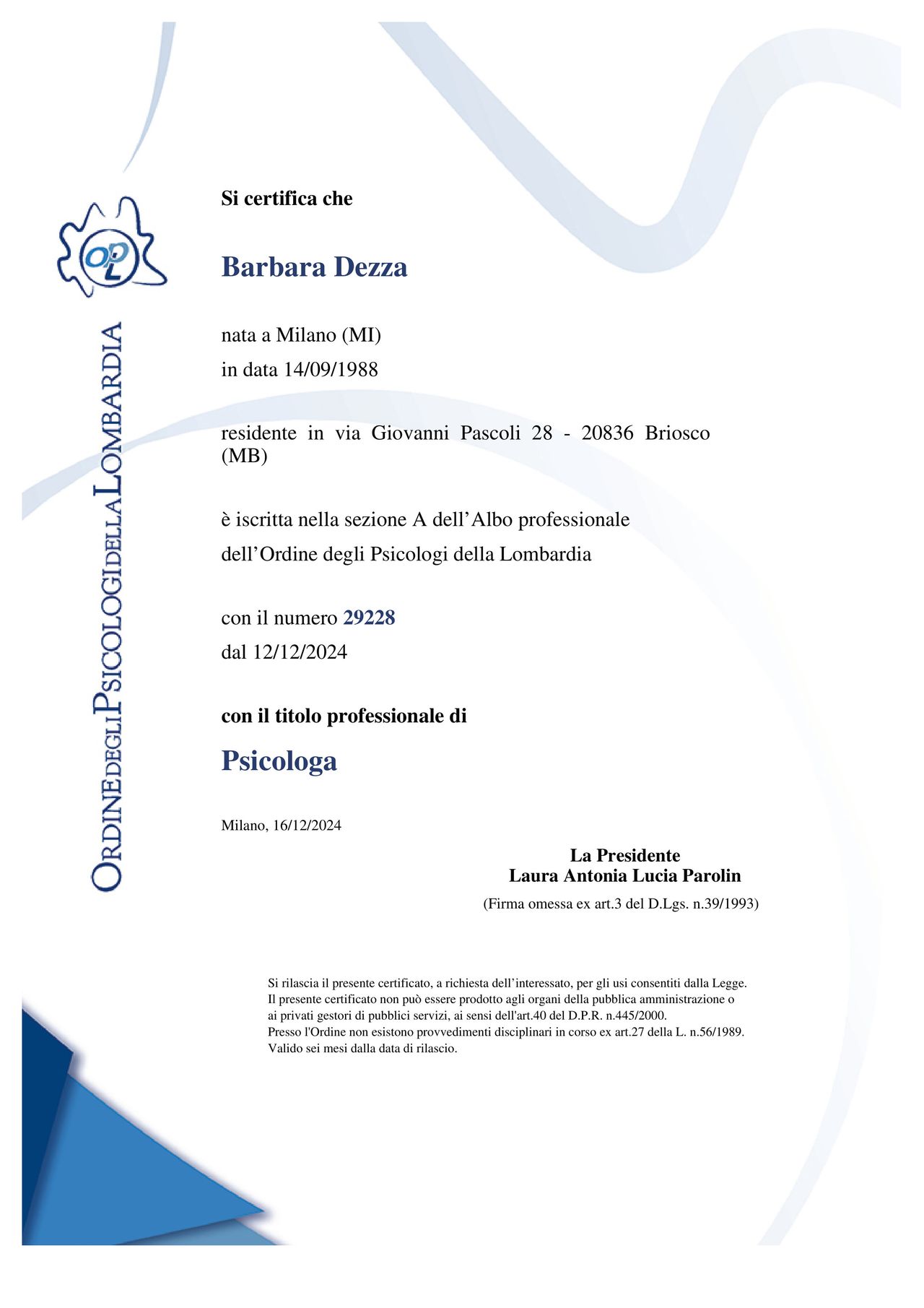 Sono regolarmente iscritta all'Ordine degli Psicologi della Lombardia (n°29228).