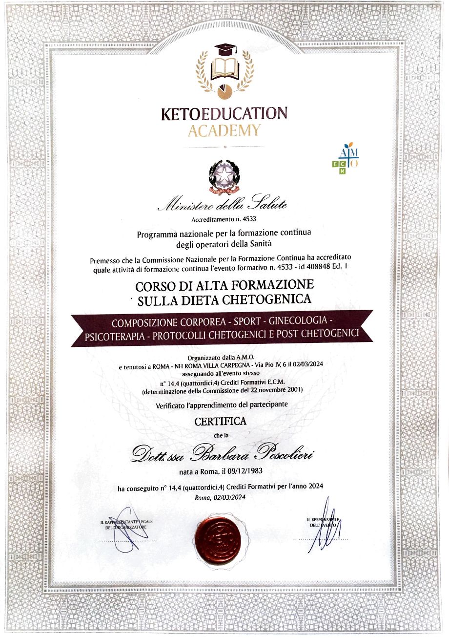 Nel 2024 segue un corso di alta formazione sulla dieta chetogenica.