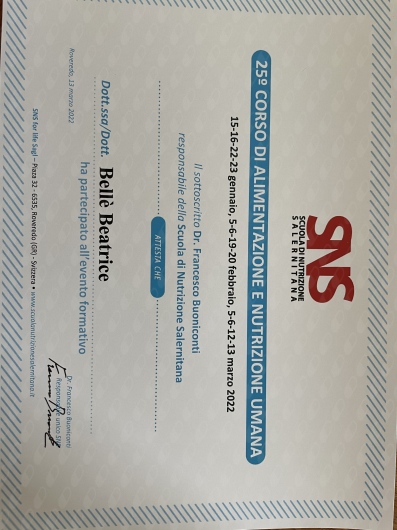 La mia formazione ed il mio aggiornamento sono continui grazie alla partecipazione a corsi, congressi e webinar in ambito alimentare sia clinico che non.