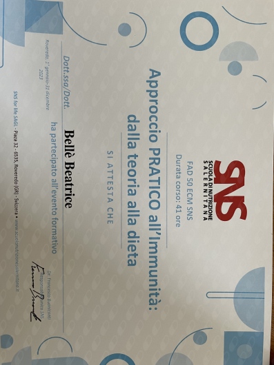 Ho sostenuto e superato l’ESAME DI STATO per l’abilitazione alla professione di biologo nutrizionista e sono iscritta all’Albo dell’Ordine Nazionale dei Biologi – Tri_A3029 che conferisce titolo giuridico a svolgere la libera professione di Biologo Nutrizionista.