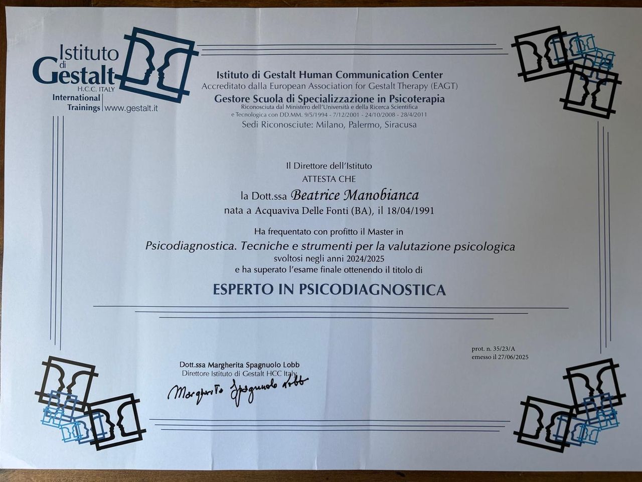 sono una psicologa e psicoterapeuta della Gestalt, un approccio esperienziale e fenomenologico che si concentra sul "qui e ora", sulla consapevolezza delle proprie emozioni e sulla responsabilità personale. Amo molto l'approccio della mia scuola di specializzazione perchè mi ha permesso di creare una un'alleanza terapeutica con l'individuo, basata sulla relazione tra due esseri umani in uno spazio sicuro e di cura. La psicoterapia della Gestalt è diventata per me una filosofia di vita, conosco e seguo i suoi principi da molti anni.