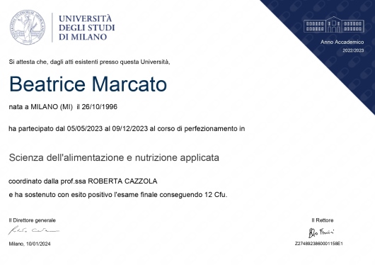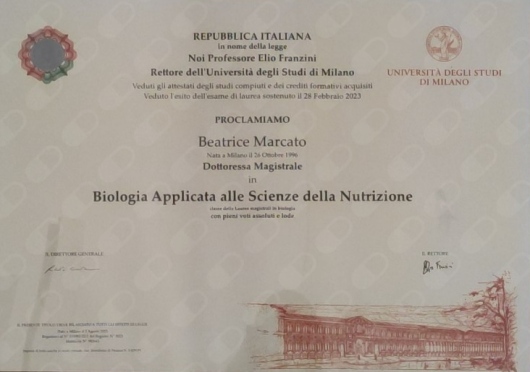 Per quanto riguarda la mia formazione, dopo la Laurea Triennale in Scienze Biologiche, ho approfondito i miei studi conseguendo la Laurea Magistrale in Biologia Applicata alle Scienze delle Nutrizione. Nei mesi successivi, ho anche frequentato e concluso con esito positivo un Corso di perfezionamento in Scienza dell’alimentazione e nutrizione applicata.