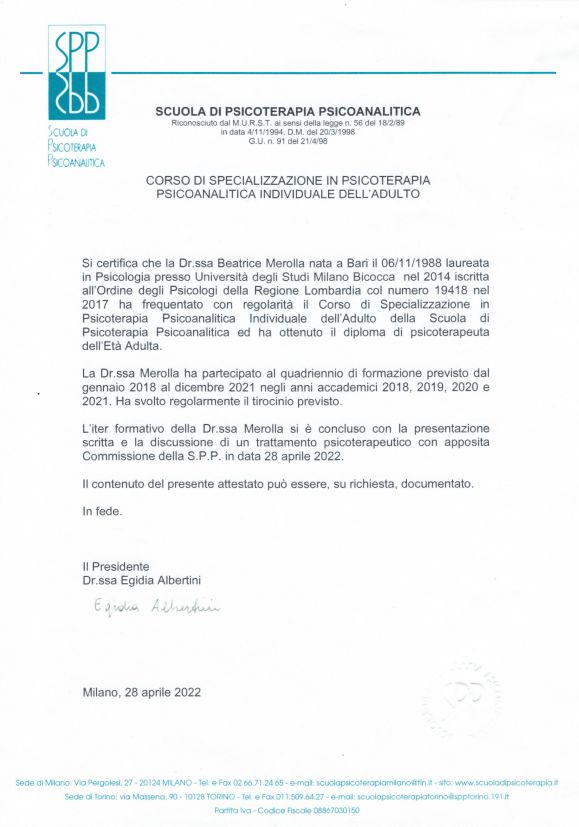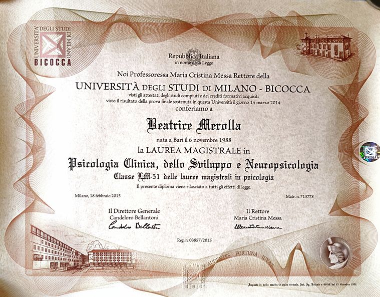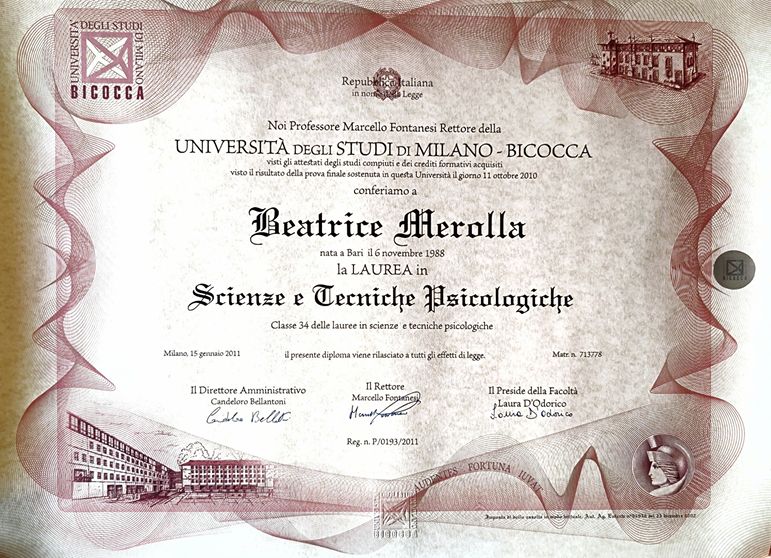 Sono la Dott.ssa Beatrice Merolla, psicologa e psicoterapeuta a Milano, iscritta all’Ordine degli Psicologi della Lombardia (n. 19418).