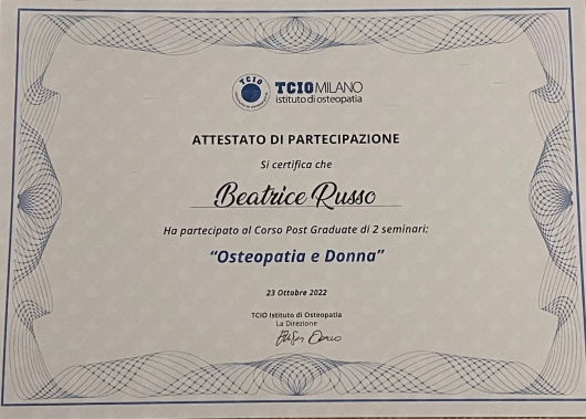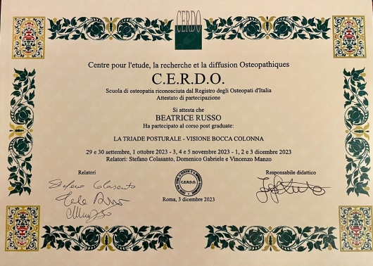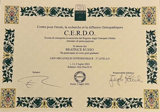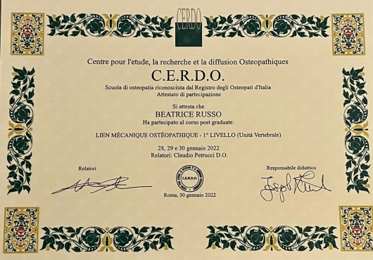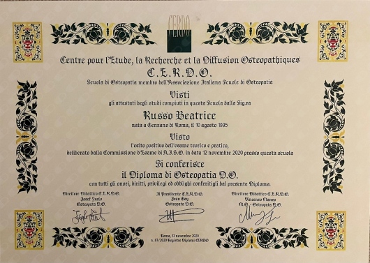 Diplomata nel 2020 presso la Scuola di Osteopatia di Roma C.E.R.D.O. (Centre pour l’Etude, la Recherche et la Diffusion Osteopathiques). Dal 2020 collaboro con società sportive del territorio. Dal 2021 lavoro presso il C.E.R.D.O. di Roma in qualità di docente/tutor. Nel 2022 ho partecipato al corso post-graduate “Osteopatia e gravidanza” organizzato dal TCIO di Milano. Nel 2021 ho partecipato al corso post-graduate LMO 1° e 2° livello “Unità vertebrale (rachide, torace e arti)” e “Periferico osteo-articolare (articolazioni, ossa lunghe, torace anteriore)”. Nel 2023 ho partecipato al corso post-graduate "La triade posturale-visione bocca colonna".