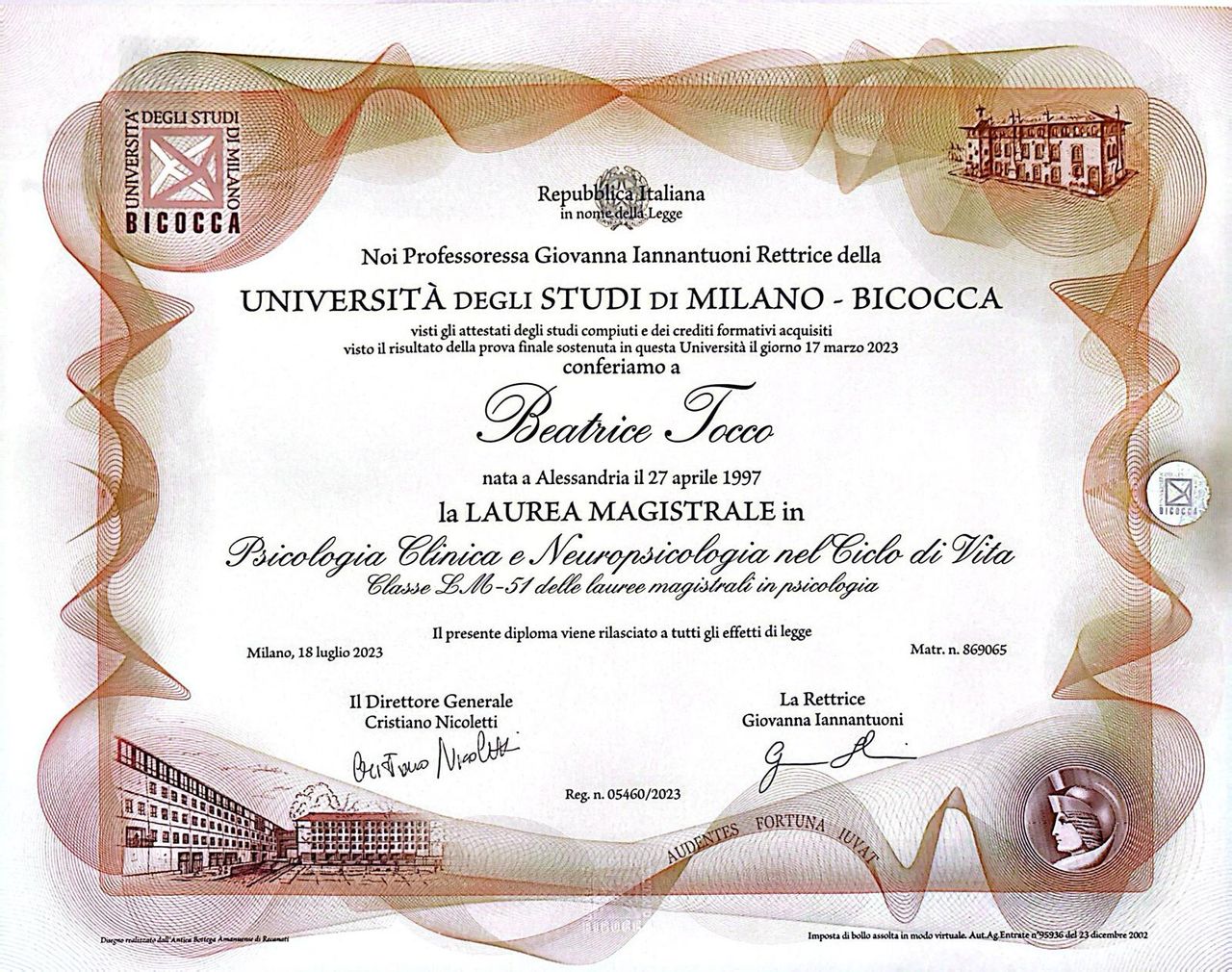 Psicologa iscritta all’Albo degli Psicologi del Piemonte. Dopo la laurea triennale in Scienze e Tecniche Psicologiche, ho conseguito la laurea magistrale in Psicologia Clinica e Neuropsicologia nel ciclo di vita, approfondendo il funzionamento emotivo e relazionale dell’individuo. Attualmente, sono specializzanda presso la scuola STPC (Studio Torinese di Psicologia Cognitiva), dove mi sto formando nell’approccio costruttivista-relazionale.