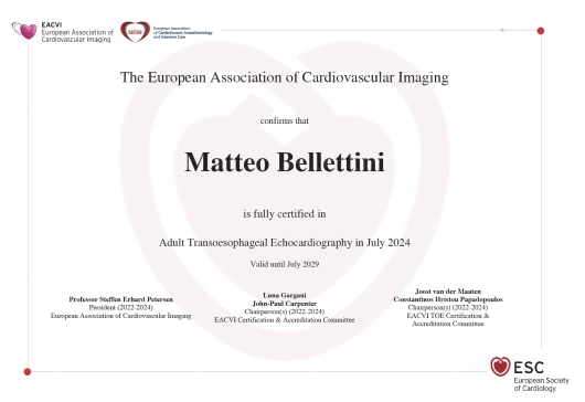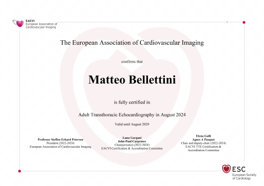 Il Dottor Bellettini ha eseguito inoltre un periodo di formazione pratica in Ecocardiografia Interventistica presso l'Ospedale San Raffaele di Milano.