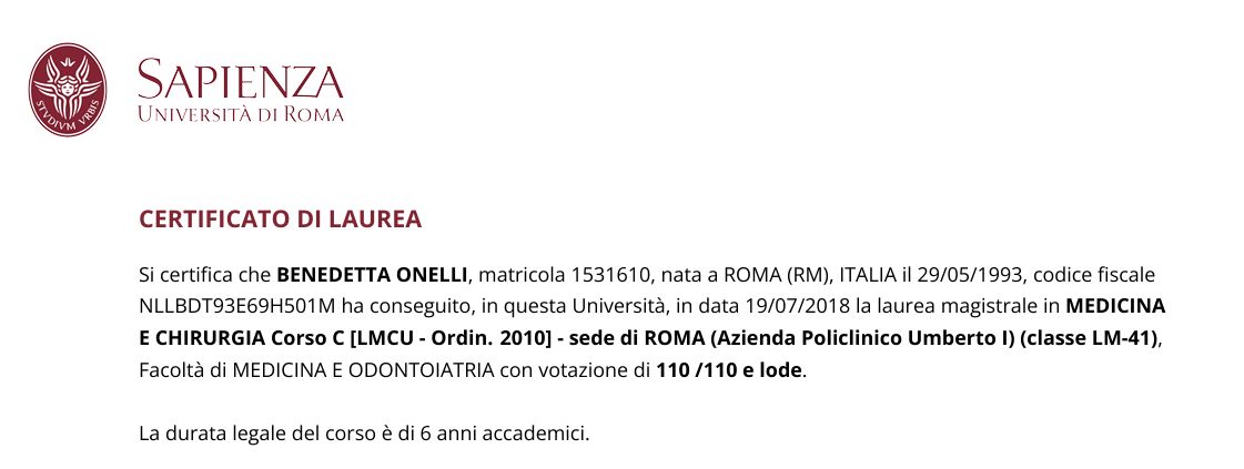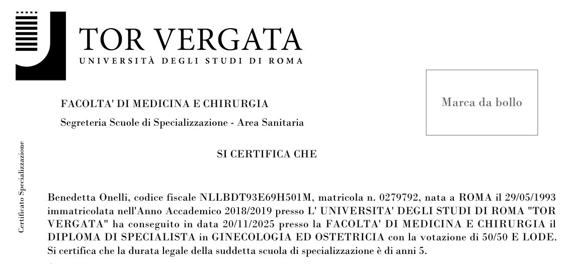 Specializzata con lode in Ginecologia ed Ostetricia, svolgo attualmente la mia attività presso l'Ospedale San Pietro Fatebenefratelli di Roma e in diversi Ambulatori Polispecialistici a Roma e nel Lazio. Mi sono formata presso l'Ospedale San Pietro FBF, maturando esperienza in attività di reparto in ginecologia, ostetricia e patologia ostetrica, pronto soccorso e sala parto. Ho inoltre avuto modo di approfondire la diagnosi prenatale e la medicina materno-fetale attraverso una collaborazione pluriennale con l'Ospedale Pediatrico Bambino Gesù di Roma, dove ho svolto attività clinica e di ricerca nell'ambito della patologia fetale.