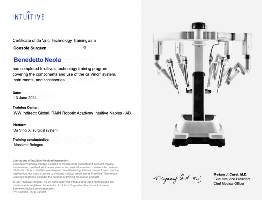 Sono Specialista in chirurgia mini-invasiva e robotica del Colon e del Retto. Ho ottenuto la certificazione "COLO-ROBOTICA" della Società Europea di Chirurgia Colorettale e la certificazione internazionale INTUITIVE di Chirurgia Robotica Mini-Invasiva addominale ed oncologica.