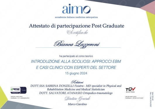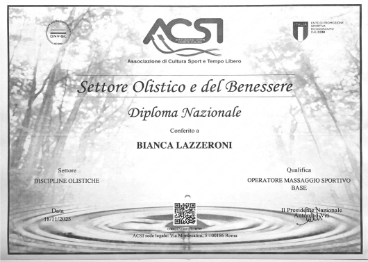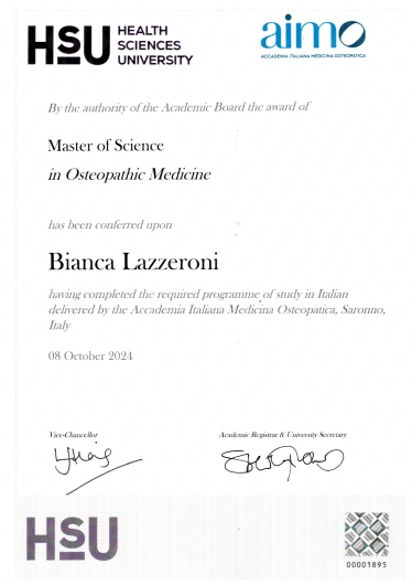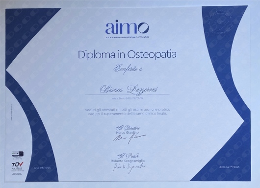 Sono Bianca Lazzeroni, osteopata con titolo MSc e D.O., iscritta al Registro degli Osteopati d'Italia (ROI) con numero 4585.