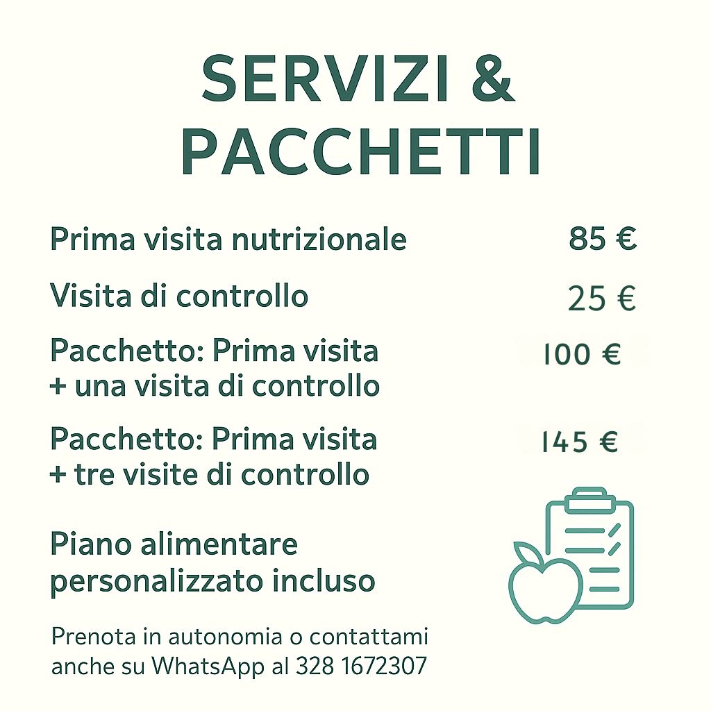 Offro consulenze nutrizionali personalizzate e pacchetti pensati per accompagnarti nel tempo, con un piano alimentare su misura e supporto costante.