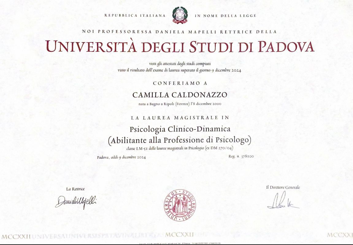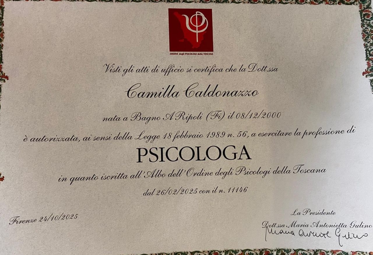 Sono Camilla Caldonazzo, Psicologa Clinico-Dinamica iscritta all'Albo degli Psicologi della Toscana. Attualmente Specializzanda presso la Scuola di Psicoterapia Psicodinamica Integrata di Firenze.