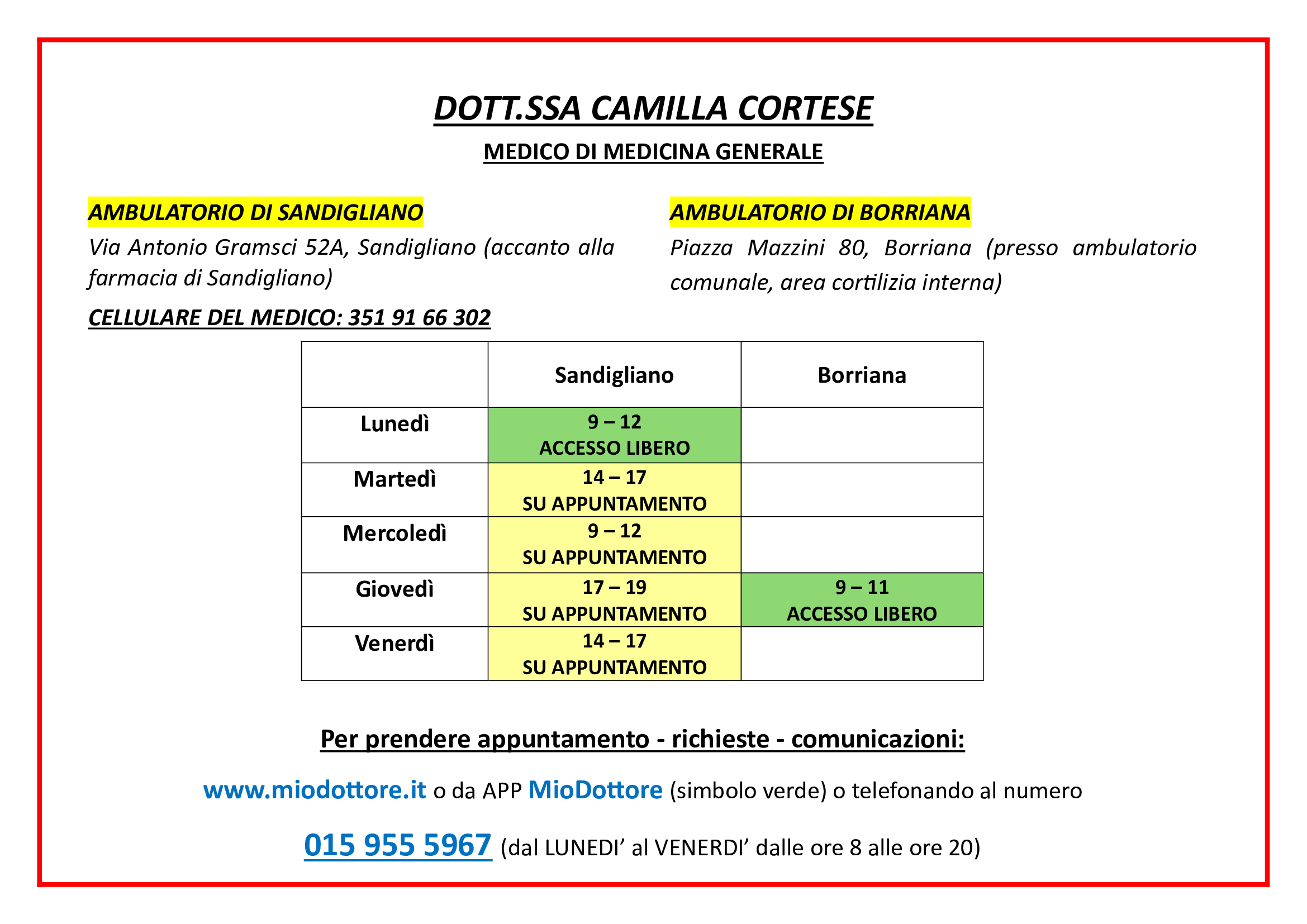 Ricevo su appuntamento il martedì', il mercoledì, il giovedì e il venerdì a Sandigliano, mentre il lunedì a Sandigliano e il giovedì a Borriana sono ad accesso libero.