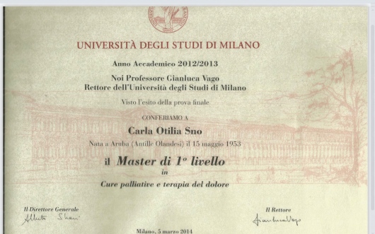 Master di 1° livello nelle Cure Palliative e Terapia del dolore presso la Facoltà di Medicina e Chirurgia dell'Università degli studi di Milano dal 2012 al 2013.