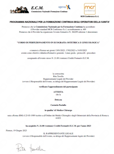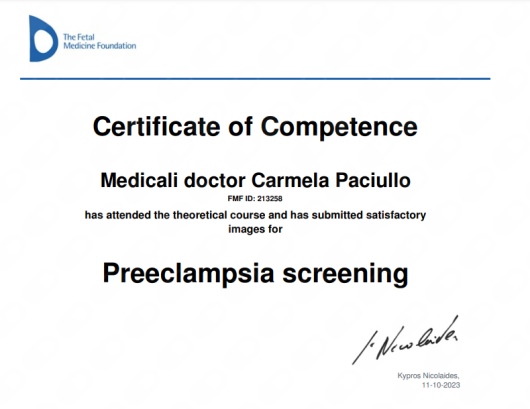 Mi sono laureata in Medicina e Chirurgia, con 110/110, presso la II Facoltà di Medicina e Psicologia (Ospedale Sant'Andrea) dell'Università degli Studi di Roma "La Sapienza". Successivamente, nel settembre 2022, ho conseguito la Specializzazione in Ginecologia e Ostetricia, con la votazione di 50/50 con lode, presso l'Università Cattolica del Sacro Cuore - Policlinico "A. Gemelli". In ambito ostetrico, ho conseguito l'abilitazione presso la Fetal Medicine Foundation per screening I Trimestre (Bi-Test) e screening Preeclampsia. Inoltre ho competenze in ecografie ostetriche e ginecologiche. Ho prestato servizio presso il reparto di ostetricia e ginecologia dell'ospedale Cristo Re di Roma e presso diversi ambulatori privati. Attualmente in forze presso l'ospedale di Velletri.