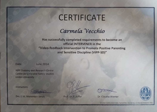 Ho esperienza nell'utilizzo del VIPP_SD Video Feedback Intervention to Promote Positive Parenting and Sensitive Discipline, un protocollo di intervento breve (sette incontri), rivolto alla diade genitore bambino/a di età compresa tra 1 e 5 anni, che utilizza le videoregistrazioni dell’interazione come tecnica di lavoro con i genitori.