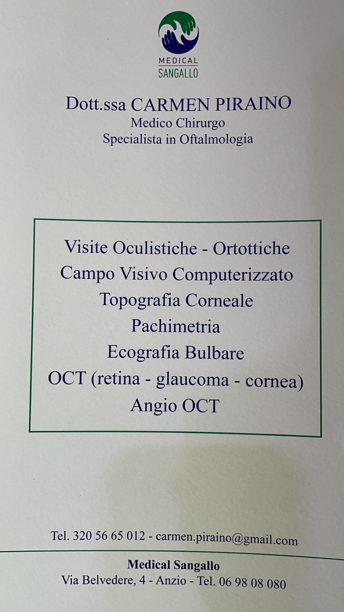 La Dottoressa Carmen Piraino, la mia oculista di fiducia è empatia,professionale e massima serietà, in poche parole consigliatissima!!