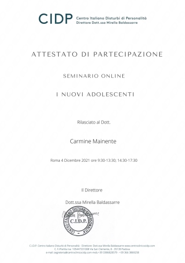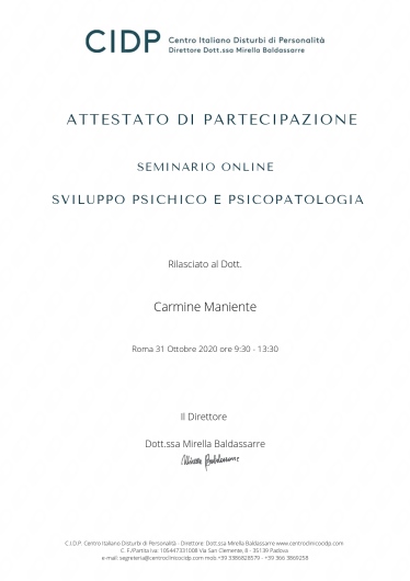In seguito, ho conseguito l'abilitazione all'esercizio della professione di Psicologo e iniziato un percorso di specializzazione in psicoterapia presso l'Istituto di Ricerche Europee in Psicoterapia Psicoanalitica (I.R.E.P.), nella sede di Padova, concluso con l'elaborato finale dal titolo: "Il caso di una famiglia in lutto" con la Prof. Mirella Baldassarre e votazione 110 e lode/110.