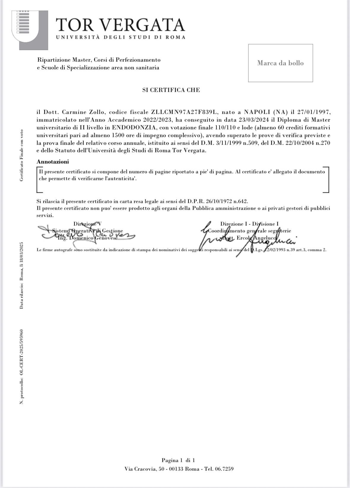 La mia esperienza con il dottor Carmine Zollo è stata eccezionale. Come il padre, dottor Elviro Zollo, dimostra una professionalità rara, unendo competenza tecnica, precisione e grande attenzione alle esigenze del paziente. Spiega ogni procedura con chiarezza, mettendo subito a proprio agio anche chi come me è una persona ansiosa.