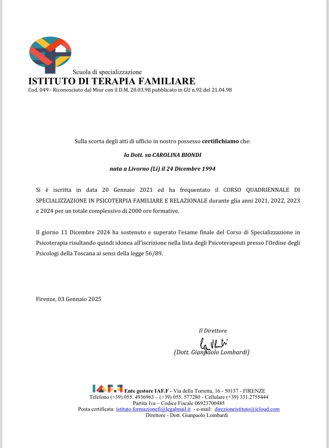 Sono la Dott.ssa Carolina Biondi, Laureata in psicologia Clinica e della Salute presso l'università di Firenze ed iscritta all'Ordine degli Psicologi della Toscana sezione A (n° 9266).