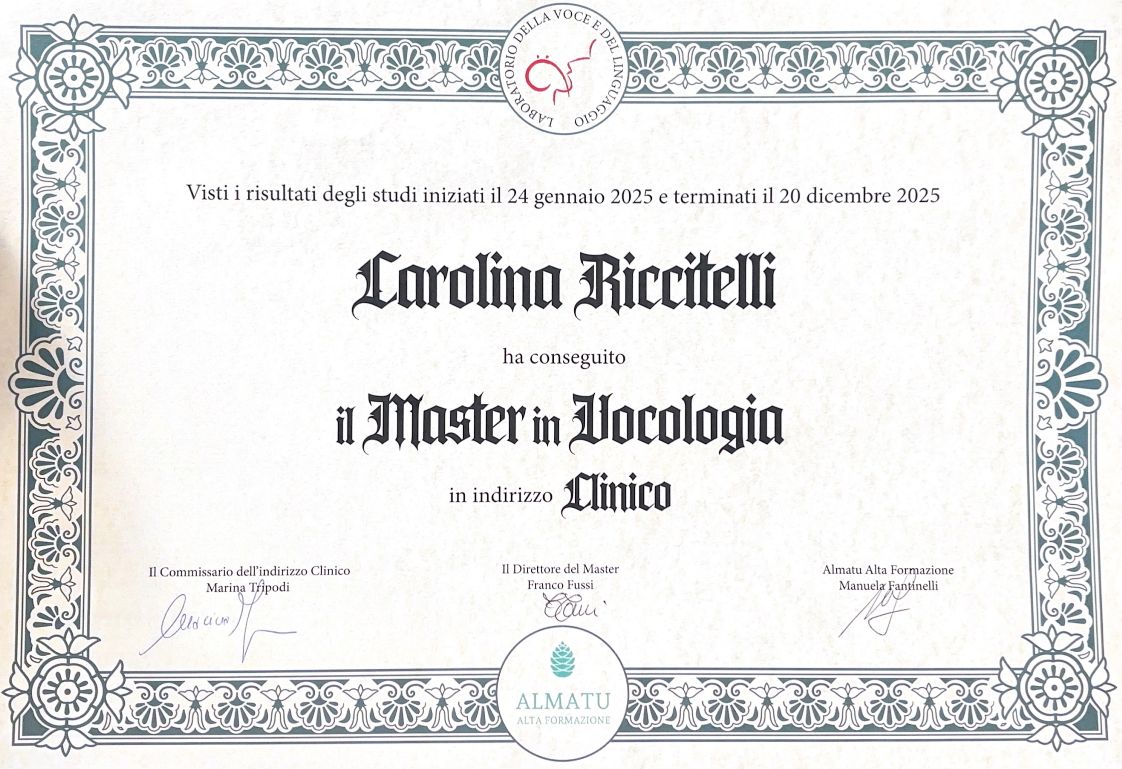 Per questo continuo a formarmi e nel 2025 ho conseguito un Master di alta formazione in Vocologia Clinica a Ravenna, diretto dal Prof. F. Fussi, per offrire ai miei pazienti un supporto sempre più specifico e attento.