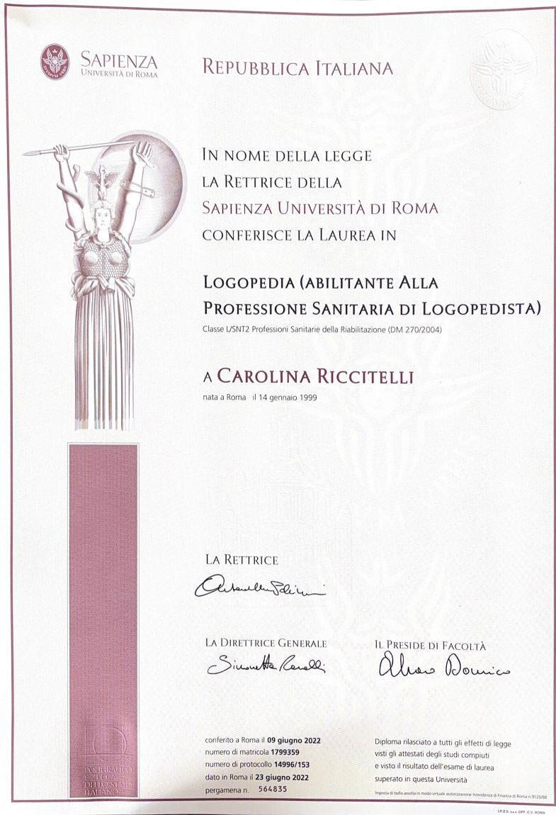Mi sono laureata in Logopedia presso l’Università degli Studi di Roma “La Sapienza” nel 2022. Nello stesso anno ho iniziato a collaborare con un centro di riabilitazione nelle zone di Ostia, Axa e Fiumicino, dove ho lavorato per tre anni.