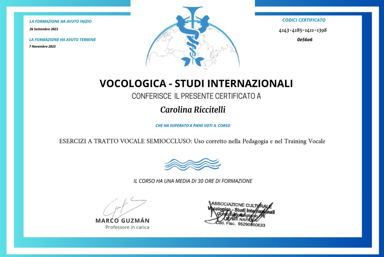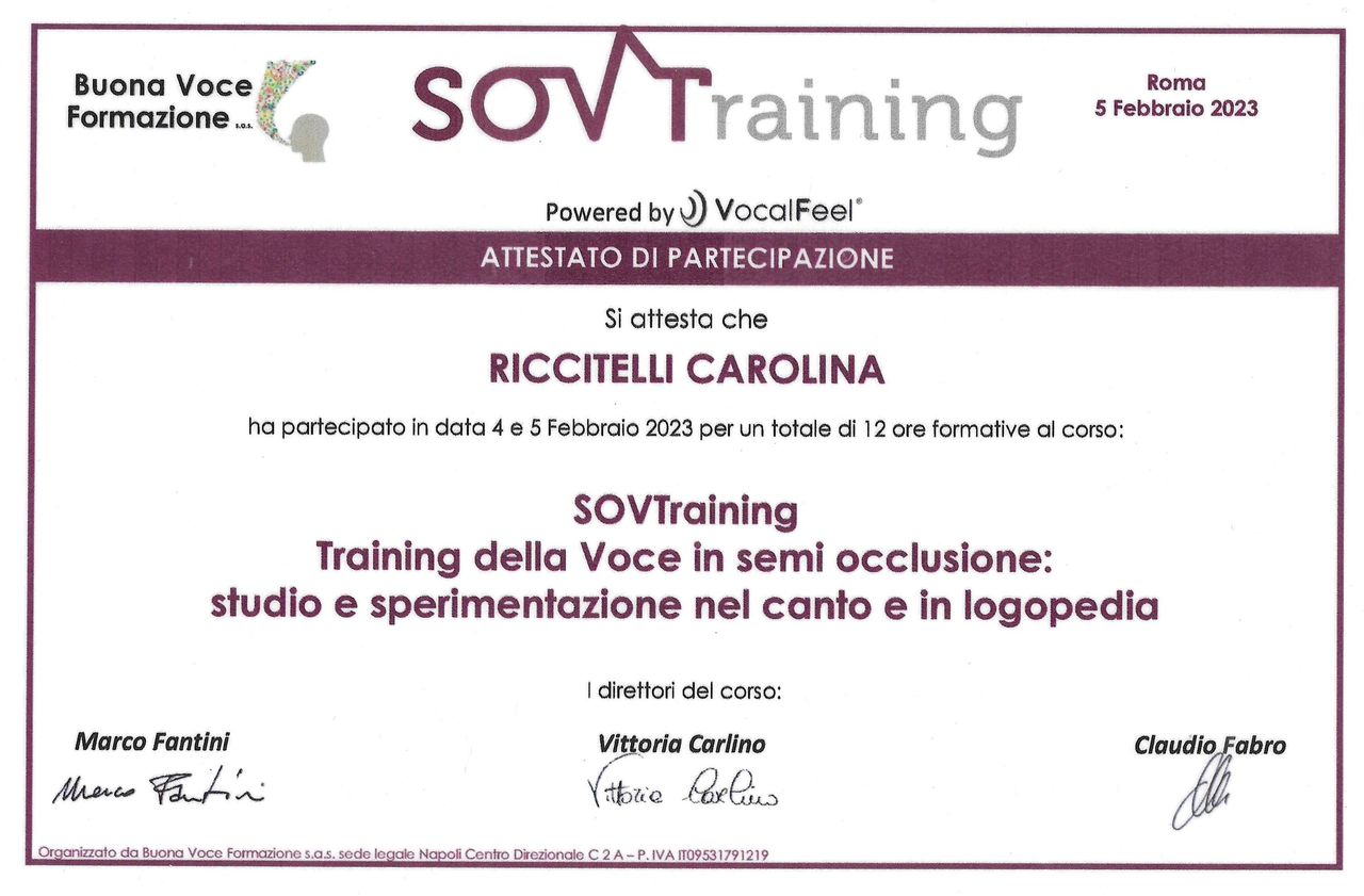 Ciao, sono la Dott.ssa Carolina Riccitelli e sono una Logopedista specializzata in Vocologia Clinica.