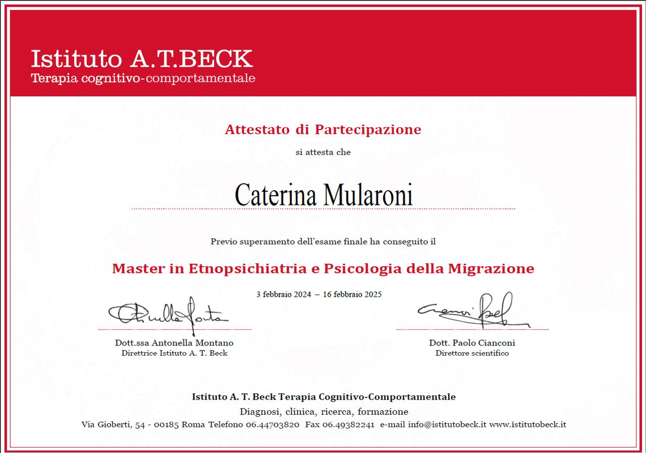 Sono la Dott.ssa Caterina Mularoni, psicologa clinica esperta in neuropsicologia e psicoterapeuta in formazione avanzata. La mia formazione si è arricchita con un master in etnopsichiatria, che mi ha permesso di integrare nella pratica clinica uno sguardo attento alle differenze culturali e alle esperienze di marginalità sociale, con particolare sensibilità verso i contesti di fragilità.