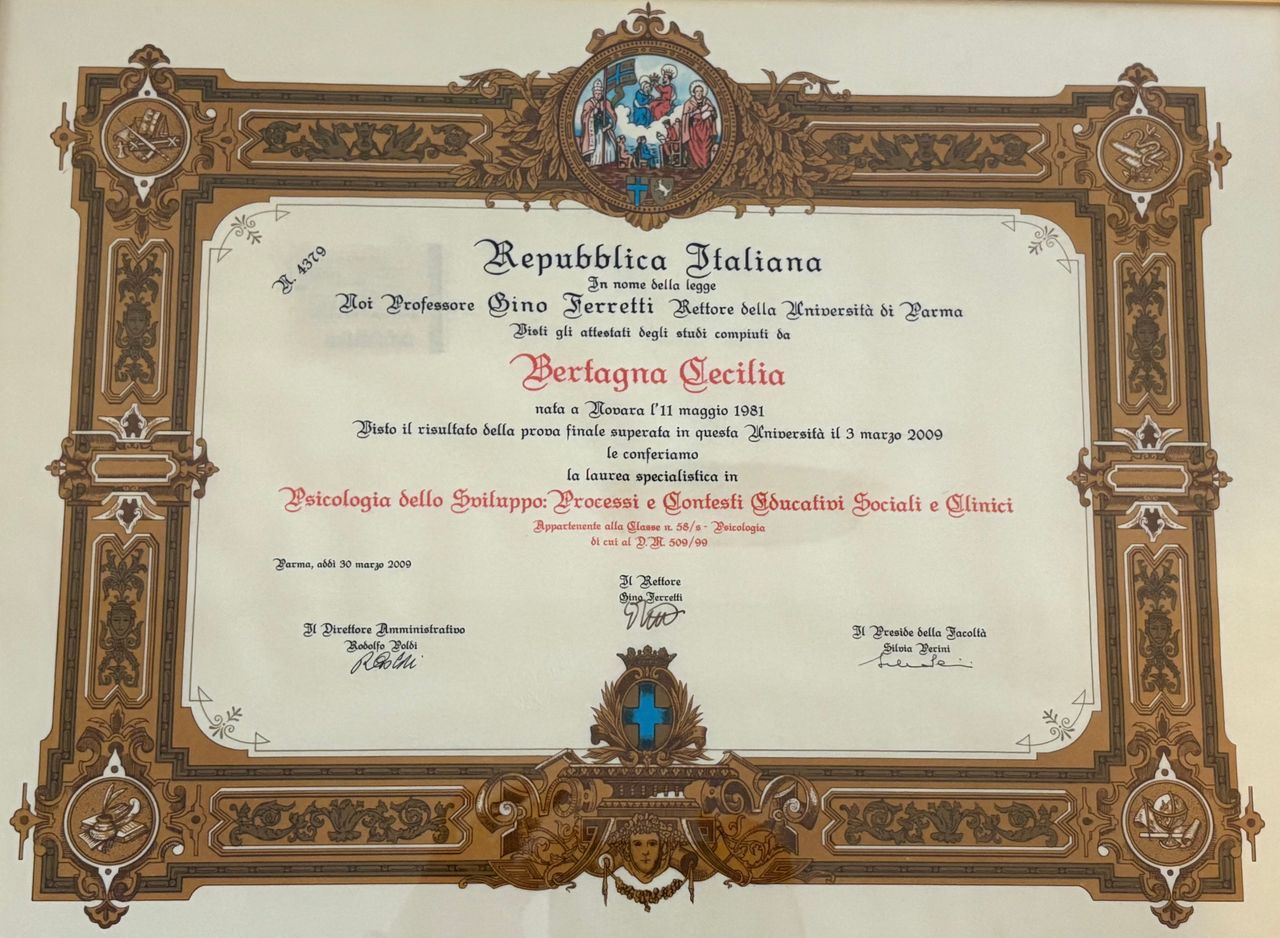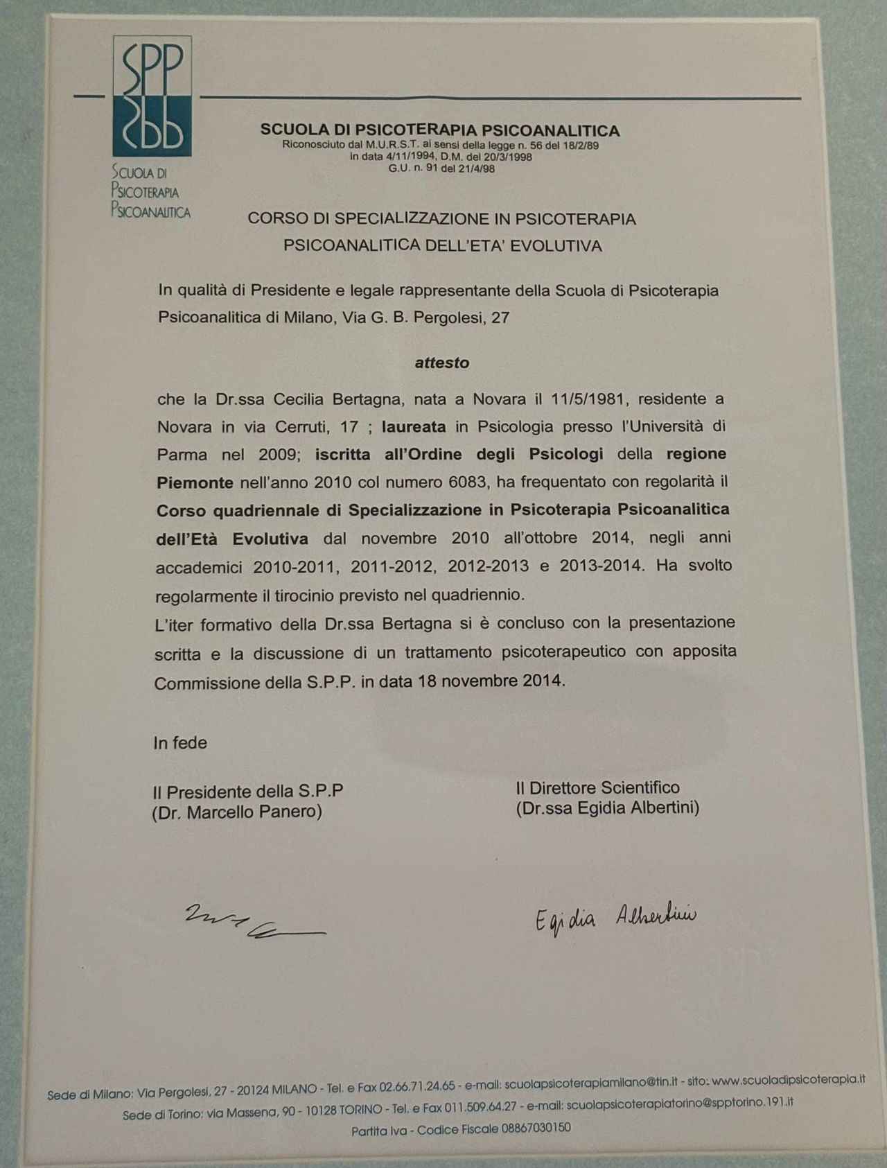 Ho conseguito la Laurea Specialistica in Psicologia Clinica: processi e contesti educativi, sociali e clinici presso l’ Università degli Studi di Parma, ottenendo il massimo dei voti. Dopo essermi iscritta all’Albo degli Psicologi del Piemonte (numero di iscrizione 6083), ho frequentato la Scuola Quadriennale di Specializzazione in Psicoterapia Psicoanalitica di Milano. Dopo aver maturato una lunga esperienza presso la Neuropsichiatria Infantile di Novara, presso l’Ospedale Maggiore della Carità e presso la ASL, ho intrapreso l'attività privata, collaborando con l’equipe dello Studio PallaLuna. Mi occupo di psicodiagnosi, sostegno psicologico e psicoterapia rivolti ad adolescenti e adulti. Sono terapeuta EMDR (Eye Movement Desensitization and Reprocessing).