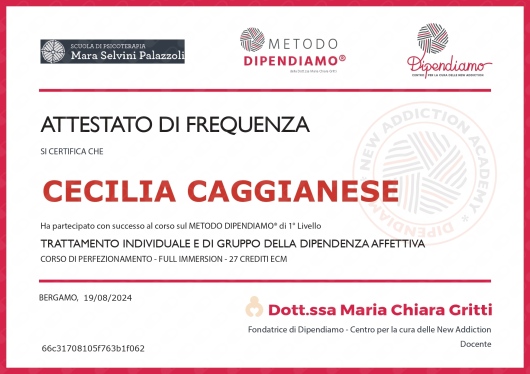 La Dotto.ssa Caggianese mi ha permesso di ricostruirmi da capo e di riordinare ogni ambito della mia vita,sostenendomi nel momento di fragilità ma anche permettendomi di camminare sola quando sembravo aver riacquisito il mio equilibrio. Questo vuol dire che nel momento in cui ha ritenuto non più necessario il suo intervento ha avuto l' onestà di dichiararlo.
