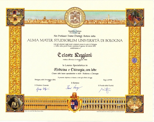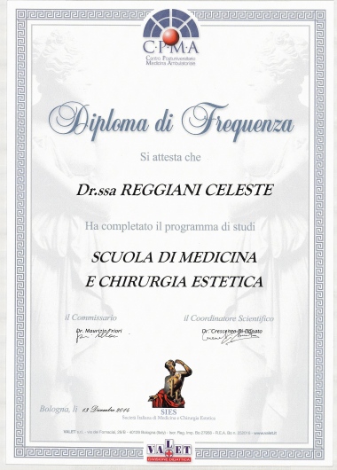 La Dott.ssa Reggiani Celeste si è laureata presso l’Università degli Studi di Bologna Alma Mater Studiorum, nel 2012, in Medicina e Chirurgia con la Votazione di 110/110 e Lode e, nel medesimo anno, viene abilitata all’esercizio della professione. Dal 2013 è regolarmente iscritta all’Albo dei Medici Chirurghi di Rimini (Ordine della Provincia di Rimini). Spinta dalla sua crescente passione per il benessere e la bellezza, presso l’Università degli Studi di Milano consegue il Master di II livello in Chirurgia Estetica, presso la scuola di alta formazione di Bologna consegue il Diploma triennale in Medicina Estetica e successivamente, per integrare i suoi studi consegue i Master in Nutrizione Umana e in Diagnosi e Trattamento dei Disturbi del Comportamento Alimentare e del Peso. Si interessa alle diverse aree dell’estetica e infatti si perfeziona in Autotrapianto di capelli (Fut e Fue). Frequenta con costanza corsi d’aggiornamento e congressi sia nazionali che esteri.