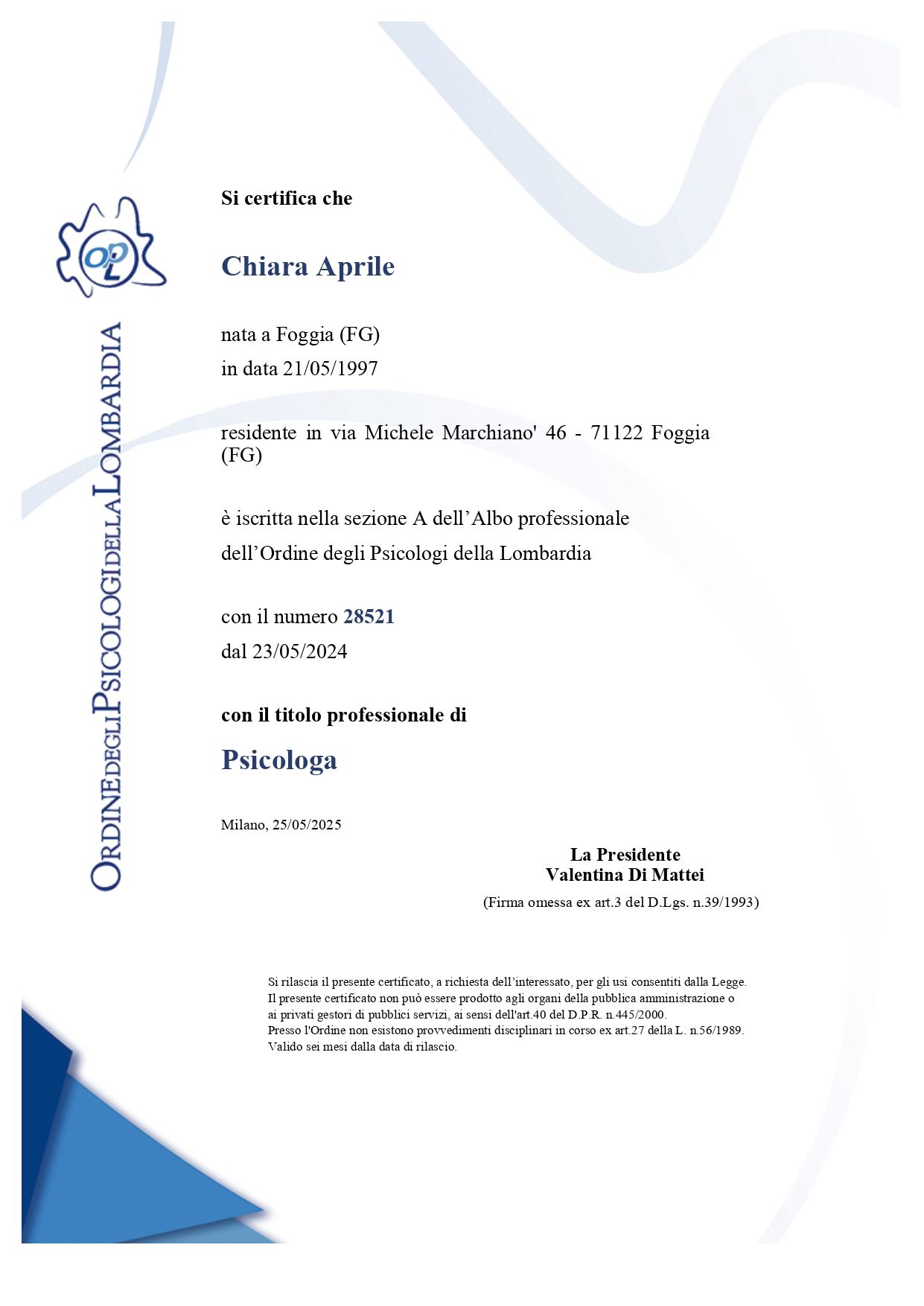 Mi sono rivolta alla dottoressa Aprile in un periodo di forte stress e di grandi cambiamenti nella mia vita. Non avevo mai intrapreso prima un percorso di terapia e inizialmente ero un po’ diffidente, perché non sapevo se sarei riuscita ad aprirmi davvero. Con il tempo, però, posso dire di essere molto felice di aver fatto questo passo. Fin dal primo incontro si è dimostrata gentile, accogliente e molto professionale, riuscendo a mettermi subito a mio agio e creando uno spazio sicuro in cui mi sono sentita ascoltata senza giudizio. Durante il percorso mi ha aiutata a comprendere meglio me stessa, a dare un nome a emozioni e pensieri che spesso facevo fatica a esprimere e a scoprire parti di me che non conoscevo. Grazie al suo supporto ho iniziato a guardare le difficoltà con maggiore consapevolezza e a sviluppare strumenti utili per affrontarle. Consiglio questo percorso con la dottoressa Aprile a chiunque senta il bisogno di fermarsi, capirsi meglio e prendersi cura di sé.
