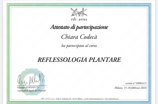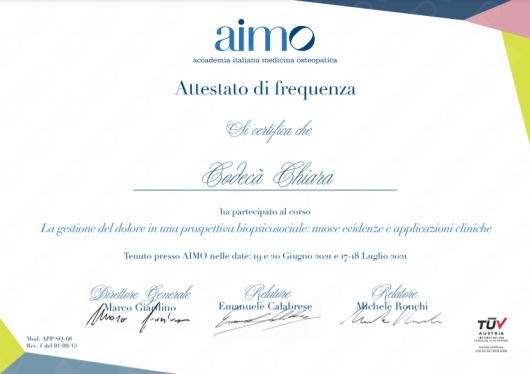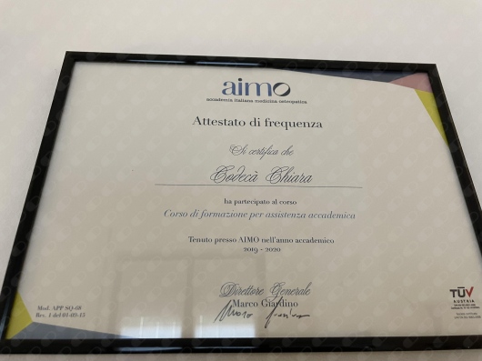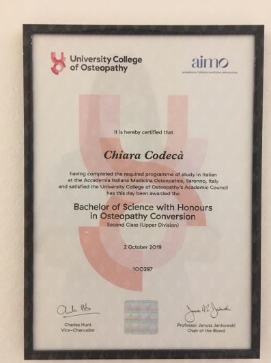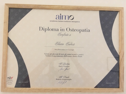 Ho ottenuto un diploma quinquennale in Osteopatia presso “AIMO” Accademia Italiana di Medicina Osteopatica con sede a Saronno. Ho inoltre conseguito un corso di conversione del diploma italiano di Osteopatia in quello di “Bachelor of Science in Osteopathy”, rilasciato da “UCO” Università College of Osteopathy con sede a Londra.