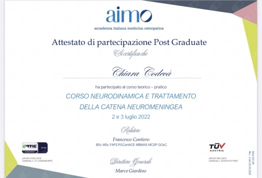 Ho partecipato a diversi corsi post-graduate tra cui “Kinesio Taping Method”, “Clinica Gnatologica e Osteopatica”, “Riabilitazione dei Disordini temporomandibolari”, "Il dolore attraverso una prospettiva biopsicosociale", "Neurodinamica e trattamento della catena neuromeningea".