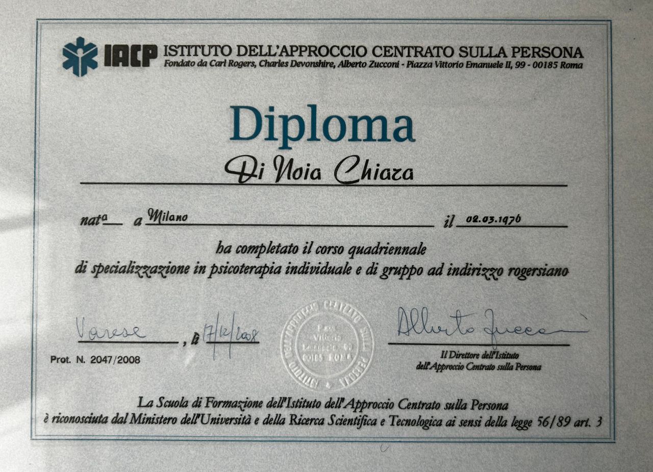 Ho conseguito la Laurea in Psicologia, nell'indirizzo Psicologia Sociale e dello Sviluppo, presso l'Università del Sacro Cuore di Milano nel 2001. Successivamente mi sono specializzata in Psicoterapia individuale e di gruppo ad indirizzo rogersiano presso la scuola IACP di Milano-Roma.