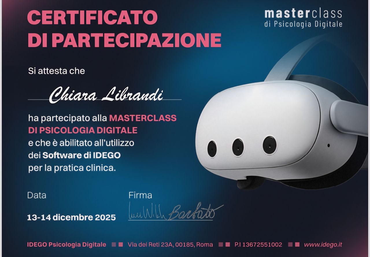 Nel mio lavoro clinico integro, quando indicato, l’utilizzo della Realtà Virtuale in psicoterapia, uno strumento innovativo che permette di lavorare in modo esperienziale su ansia, fobie e difficoltà emotive.