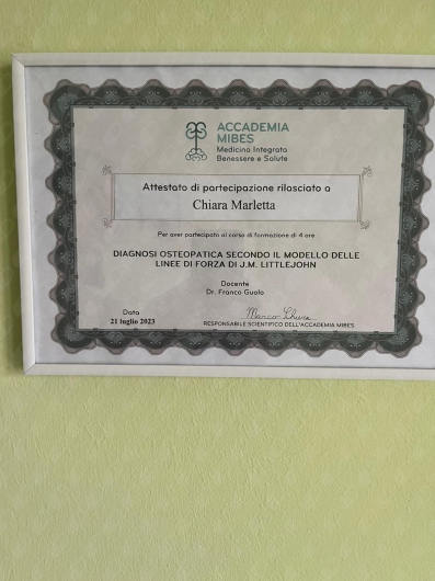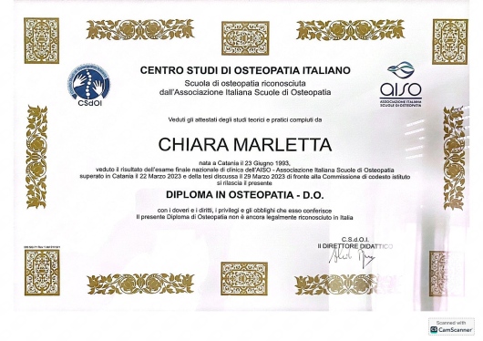 Ciao, sono Chiara Marletta, Osteopata D.O., e sono qui per aiutarti a riscoprire il tuo benessere. Il mio percorso in osteopatia è iniziato con una grande passione per il corpo umano e il suo straordinario potere di autoguarigione. Ho studiato a tempo pieno presso il Centro Studi di Osteopatia Italiano (C.S.d.O.I.), dove ho conseguito il titolo di Osteopata D.O., seguendo un intenso percorso di formazione e pratica clinica di 5 anni.