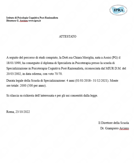 Porgo i miei più sentiti complimenti alla dottoressa Chiara Moriglia, per avermi seguito anche se pur brevemente nel mio percorso.
