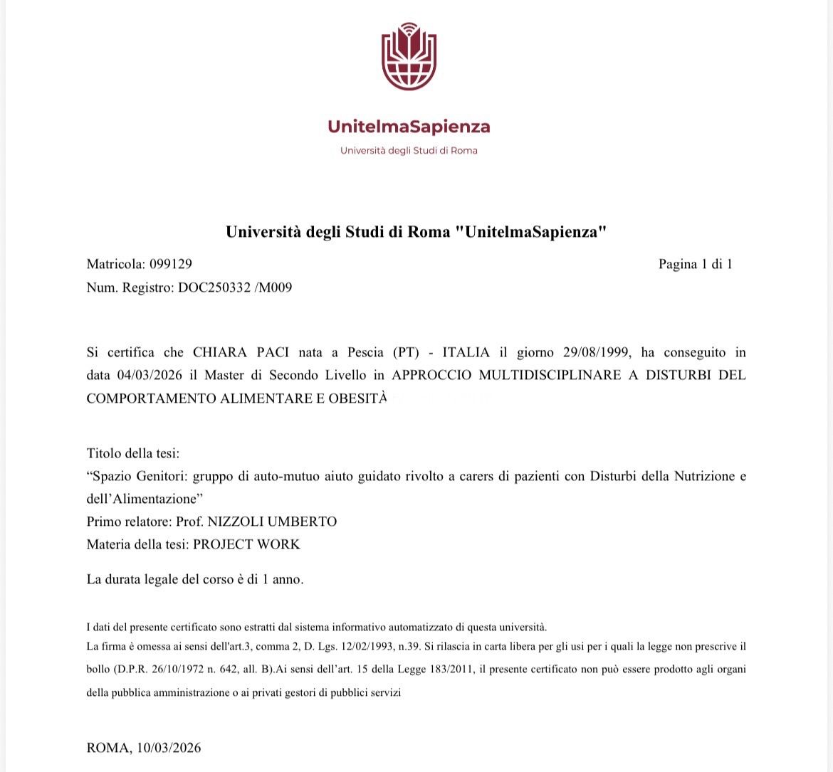 Sono la dottoressa Paci Chiara e sono una psicologa clinica, laureata presso l'Università degli studi di Padova.