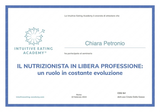 Durante la mia gravidanza ho avuto la fortuna di essere seguita dalla Dott.ssa Chiara Petronio, una professionista attenta, empatica e molto preparata. Fin dal primo incontro mi ha fatta sentire ascoltata e supportata, personalizzando il piano alimentare in base alle mie esigenze e ai cambiamenti del corpo durante questo delicato periodo.
