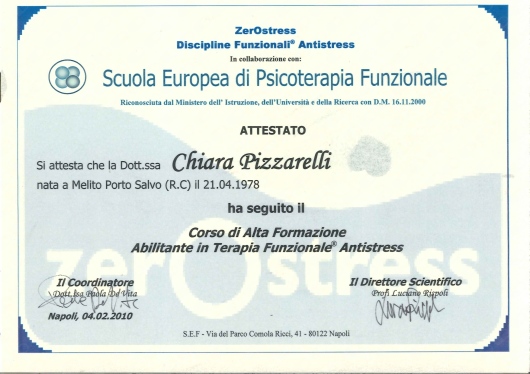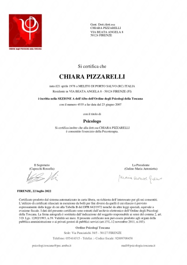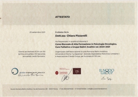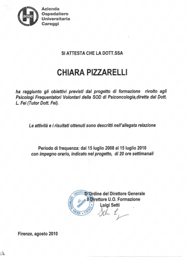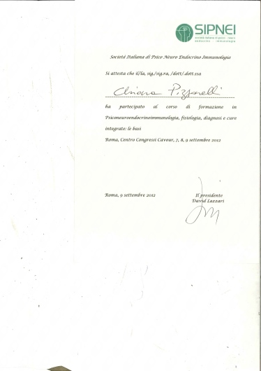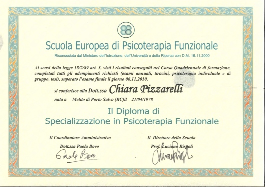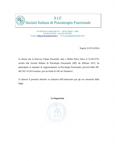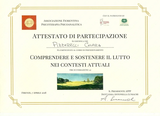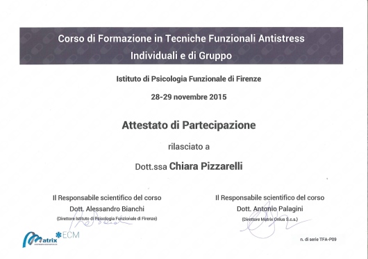 Sono socia dell’Istituto di Psicologia Funzionale di Firenze presso cui svolgo la libera professione e di cui seguo le attività formative e di supervisione. Ho maturato una formazione all'interno della SIF (società italiana di psicoterapia funzionale), della SIPNEI, della SIPO (società italiana di Psico-oncologia), dell’A.F.P.P. (associazione fiorentina di psicoterapia psicoanalitica), della SIRU (società italiana per la riproduzione umana sui temi della procreazione medicalmente assistita), della S.R.B.A. (scuola romana Balint analitica). Negli ultimi anni mi sto dedicando allo studio della terapia analitica jungiana.