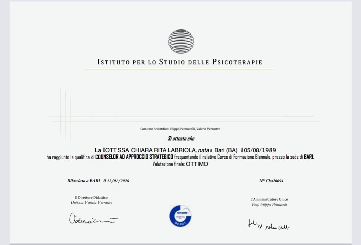 Grazie alla combinazione di tecniche strategiche, sessuologia, ipnosi, strumenti di rilassamento e competenze comunicative, supporto i miei pazienti nel superare difficoltà, gestire emozioni e sviluppare una maggiore consapevolezza di sé, favorendo crescita personale e relazionale.
