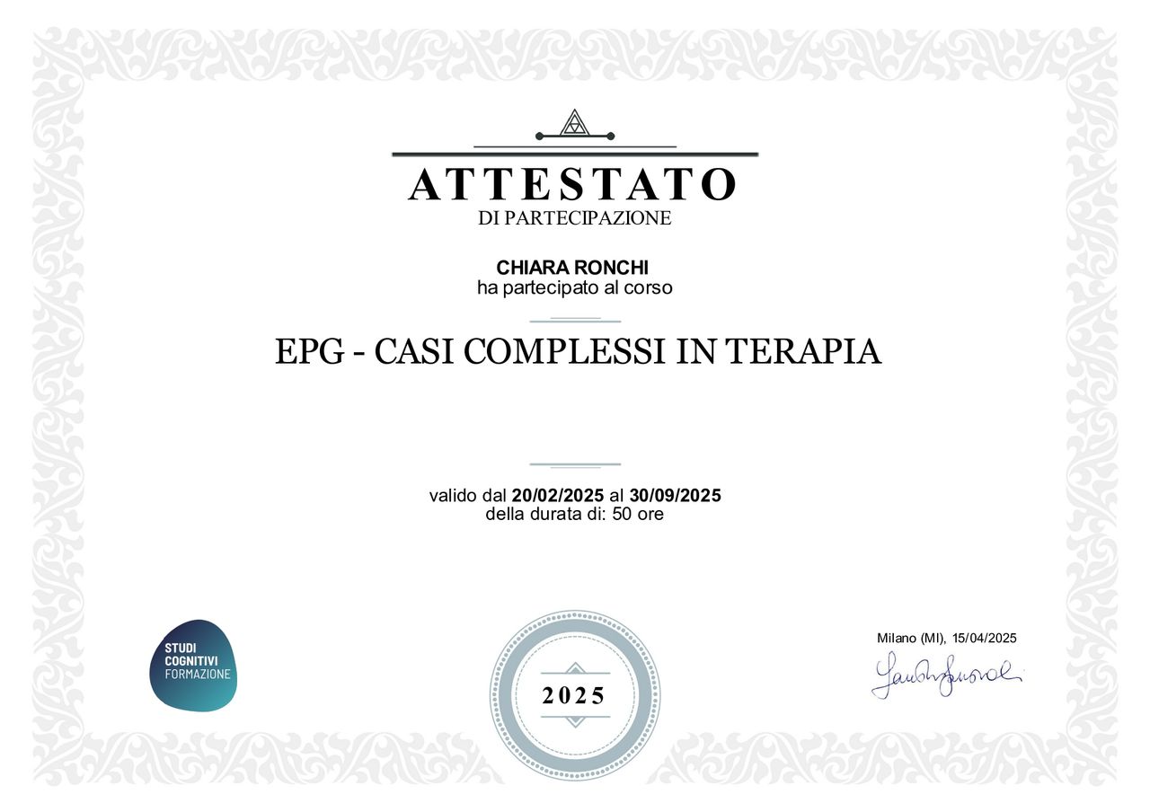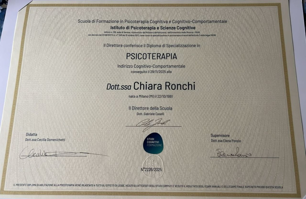 mi sono specializzata in psicoterapia cognitivo-comportamentale presso l’Istituto di Psicoterapia e Scienze Cognitive. Nella mia pratica clinica accompagno bambini, adolescenti, adulti e coppie, cercando sempre di costruire uno spazio terapeutico su misura, accogliente e rispettoso dei tempi e dei bisogni di ciascuno. Mi occupo di tematiche legate alla crescita personale, alle difficoltà emotive e relazionali, all’identità e alla gestione dello stress. Integro nella mia pratica tecniche di mindfulness, che aiutano a sviluppare maggiore consapevolezza, ascolto di sé e presenza nel qui e ora. Nel corso degli anni ho collaborato con scuole, cooperative e centri clinici in Lombardia, offrendo supporto psicologico in contesti scolastici, domiciliari e ambulatoriali. Ho lavorato con minori, famiglie e adulti, sia in situazioni di disagio acuto che nei percorsi di crescita e trasformazione personale. Le aree in cui intervengo più frequentemente includono: Disturbi d'ansia: attacchi di panico, fobie, ansia generalizzata, disturbo ossessivo-compulsivo Disturbi dell'umore: depressione, disturbo bipolare Difficoltà relazionali: in famiglia, nella coppia, sul lavoro Stress e burnout: difficoltà di adattamento e gestione delle pressioni quotidiane Elaborazione del lutto: momenti di perdita e cambiamento Crescita personale: autostima, assertività, regolazione emotiva Psicoterapia di coppia: problemi di comunicazione, conflitti, crisi relazionali Nel mio modo di lavorare cerco di mettere al centro la persona, non il sintomo. Credo molto nell’importanza dell’ascolto attivo, per far sentire chi ho davanti davvero accolto, senza giudizio. Il percorso si costruisce insieme: definiremo obiettivi chiari e condivisi, monitorando passo dopo passo i progressi. Il mio impegno è offrire professionalità, rispetto, riservatezza e un accompagnamento autentico, fondato su fiducia e presenza.
