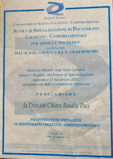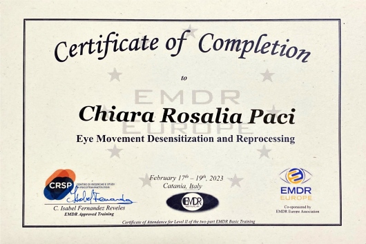 Nel 2020 mi sono specializzata in Psicoterapia Cognitivo Comportamentale e ho partecipato ai corsi di I e II livello in EMDR.