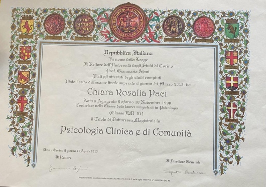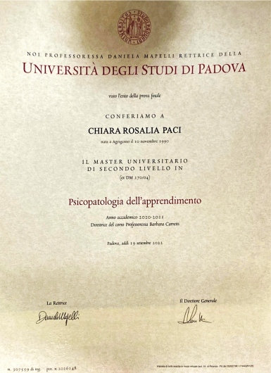 Nel 2021 ho concluso il Master in Psicopatologia dell'Apprendimento.