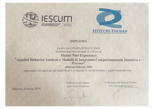 Nel 2018 ho concluso il Master di I livello in Applied Behavior Analysis (ABA).